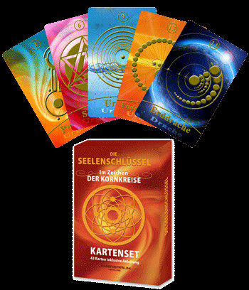 Die Seelenschlüssel Im Zeichen der KornkreiseWie der Name bereits verrät, sind die Seelenschlüssel Türöffner zu deinen eigenen Seelenkräften. Sie sprechen vor allem jene Sehnsüchte an, die in dir, in deiner Seelenstruktur angelegt sind. Diese Sehnsüchte sind nämlich intensive und vor allem emotionale Wegweiser. Wenn es dir gelingt, diese Wegweiser zu erkennen und zu erspüren, eröffnen sich dir erfüllende und durchaus bewegende Lebenswege! Als Symbolsprache erscheinen auf diesen Karten jene Piktogramme, die Jahr für Jahr in den Kornkreisen sichtbar werden. Diese Piktogramme sprechen nämlich in einer wunderschönen und klaren Weise die „Seelensprache“. Du wirst eine Resonanz, eine emotionale und auch körperliche „Vibration“ wahrnehmen können, wenn du eine Karte betrachtest und auf dich wirken lässt. Bereits das Einlassen auf eine einzelne Karte kann dein Leben verändern!Möge dieses Kartenset dich nachhaltig erfüllen und inspirieren!43 Karten, Größe ca. 8 mal 13 cm, mit Booklet (Beschreibung der einzelnen Karten, Verwendung als Orakel oder als Seelen-Schlüssel), in sehr schöner Verpackung.Preis: Fr. 31.- + VersandspesenDas Kartenset kann bestellt werden per E-Mail: pia.blaser@bluewin.ch