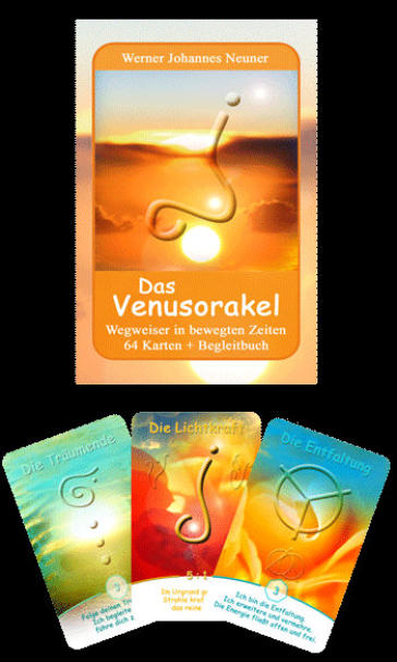 Das VenusorakelWegweiser in bewegten ZeitenGewidmet all jenen, die auf dem Weg sind, allen Suchenden und allen Fragenden. Gewidmet all jenen Menschen, die den Mut haben, durch diese bewegten Zeiten zu reisen. Gewidmet all jenen Menschen,die offenen Geistes und offenen Herzens sind.Es berührt mit seinen Antworten dein Herz. Und es eröffnet mit seinen Antworten deinen Geist. Dies ist mehr als ein Orakel. Dieses Kartendeck macht die Muster der Zeit sichtbar. 64 sehr schöne Karten, 13 mal 8 cm, inkl. Begleitbüchlein mit 90 Seiten, in sehr schöner Verpackung.Du hältst mit dem Venusorakel ein wertvolles Werkzeug in Händen, das den Neuner-Kalender ergänzt.Wie das Venusorakel gemeinsam mit dem Neuner-Kalender verwendet werden kann und wie du dadurch mit den Muster der Zeit in Einklang kommst, erfährst du hier.Preis: Fr. 31.- + VersandspesenDas Kartenset kann bestellt werden per E-Mail: pia.blaser@bluewin.ch